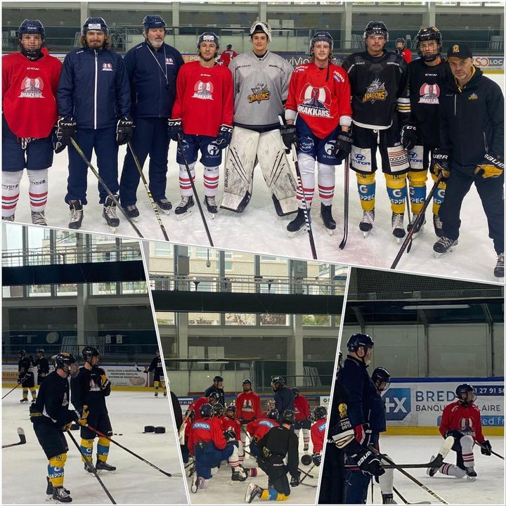 🟥🟦 Ce jeudi 25 août s’est tenue une belle journée d’échanges et de partage entre les techniciens et les joueurs des Drakkars de Caen et des Dragons de Rouen sur la glace de Caen la mer.