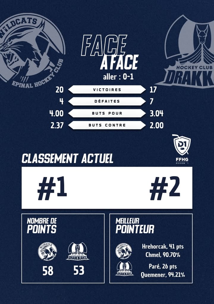 Gros choc ce mardi soir (20h15) entre les Wildcats Epinal et nos Drakkars. Les deux premiers du classement s’affrontent. Les caennais avaient blanchi les spinaliens 1-0 lors du match aller, avec 41 arrêts de Ronan Q. Notre gardien qui vient de réaliser son 3ème jeu blanc de la saison contre Neuilly samedi.