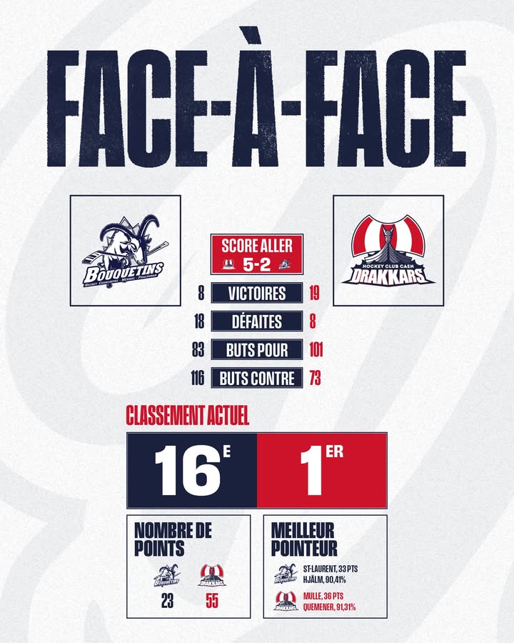 Avec 27 matchs joués pour Caen et 26 pour HCMP, vos Drakkars ont l’avantage au classement avec 19 victoires (dont 5 en prolongation) et 101 buts marqués, les bouquetins eux comptent 8 victoires et 83 buts marqués.