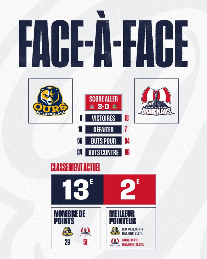Avec 25 matchs joués pour Caen et Villard-De-Lans, vos Drakkars ont l’avantage au classement avec 18 victoires (dont 5 en prolongation) et 94 buts marqués, les villardiens eux comptent 9 victoires et 56 buts marqués.