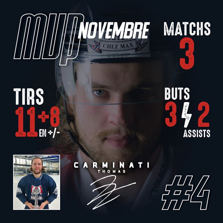 Grâce à vos votes sur Facebook et Instagram, c’est notre défenseur #4 Thomas Carminati qui a été désigné Drakkar de Novembre. Il devance de peu nos 3 autres nominés Félix Chamberland, Marc Beckstead et Quentin Berthon.