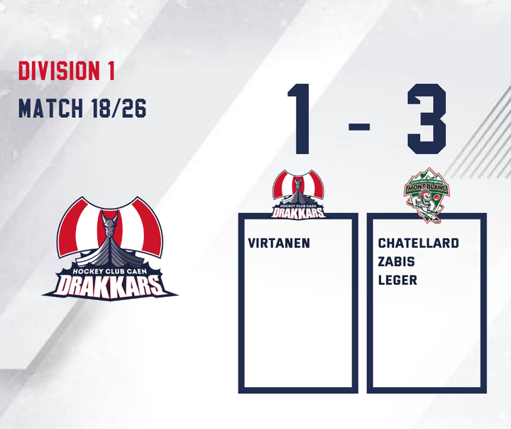 De son côté, Mont Blanc trouvera la faille à 10 minutes du terme de la rencontre par l’intermédiaire de Bruno ZABIS. Les visiteurs se mettront à l’abris à la 58:13 sur un contre bien conclu par Eric LEGER. Malgré cette défaite 3-1, les Drakkars restent 4èmes au classement général de la D1 avec deux matchs en retard sur leur adversaire du soir. La prochaine rencontre des hommes de Luc CHAUVEL se déroulera à domicile ce jeudi face aux remparts de Tours, avant dernier du classement.